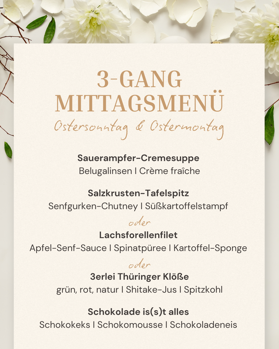 Mittags servieren wir euch ein 3-Gang-Menü, am Abend ein 4-Gang-Menü mit frühlingshaften Aromen und feinen Kompositionen.
