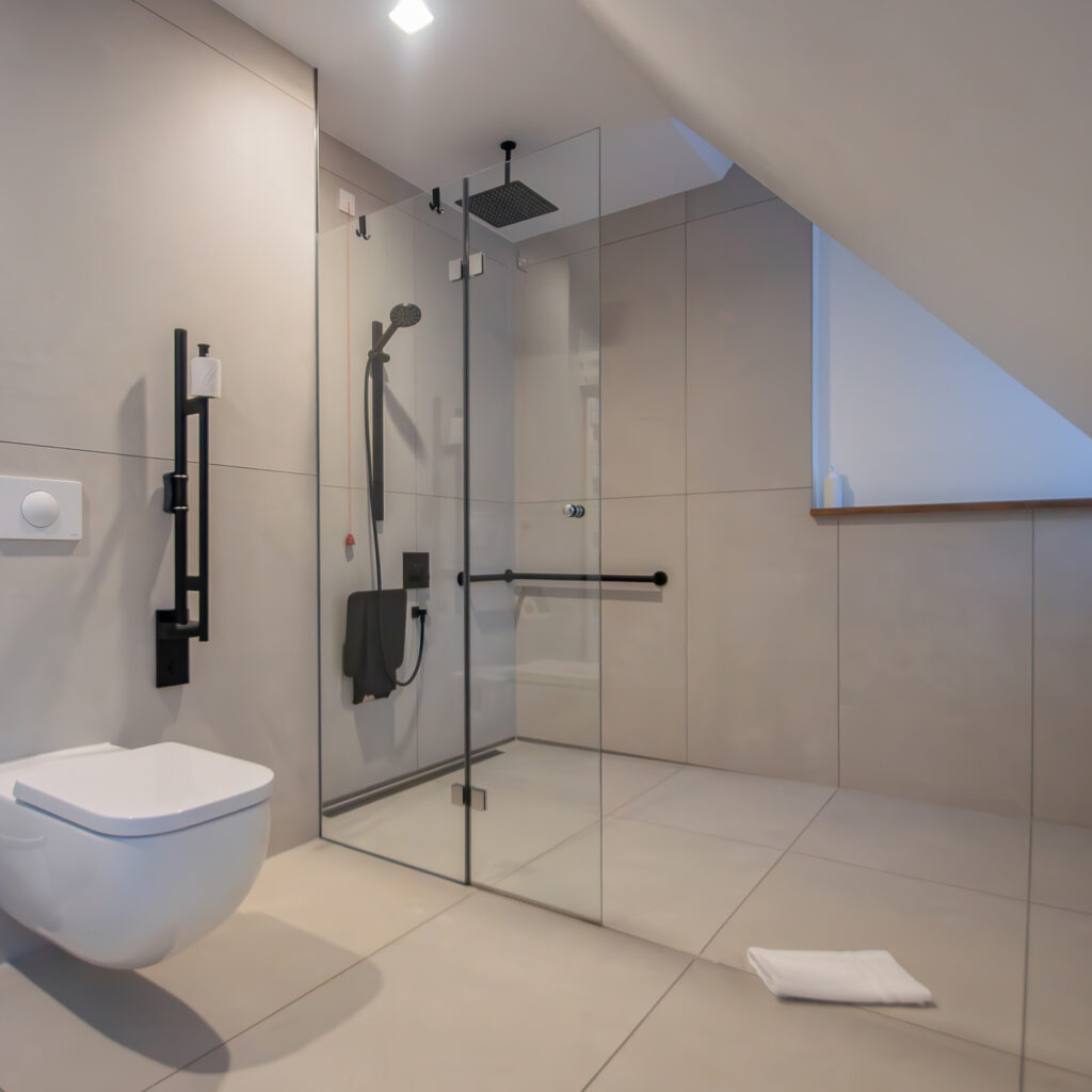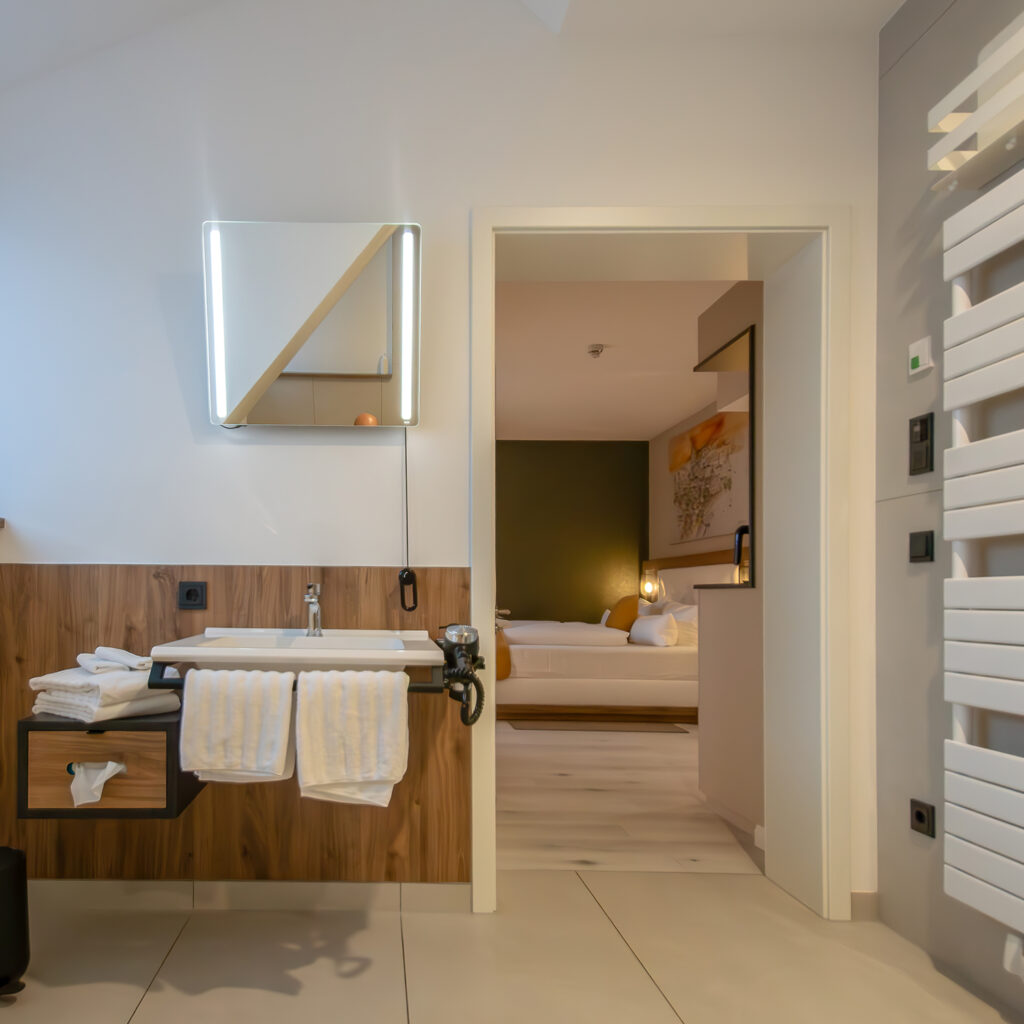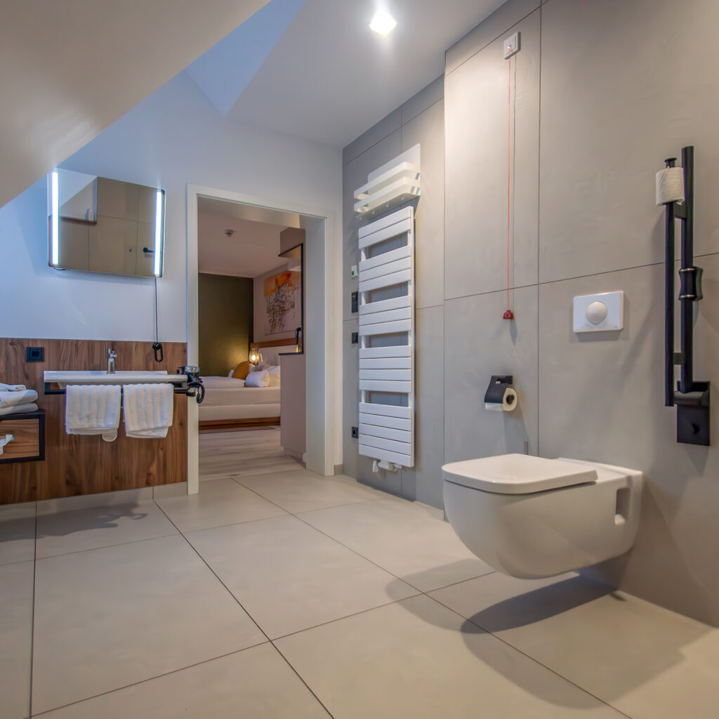 • Badezimmer mit Regendusche (inkl. Duschsitz + Haltestange) und unterfahrbarem Waschbecken, Notruf zur Rezeption